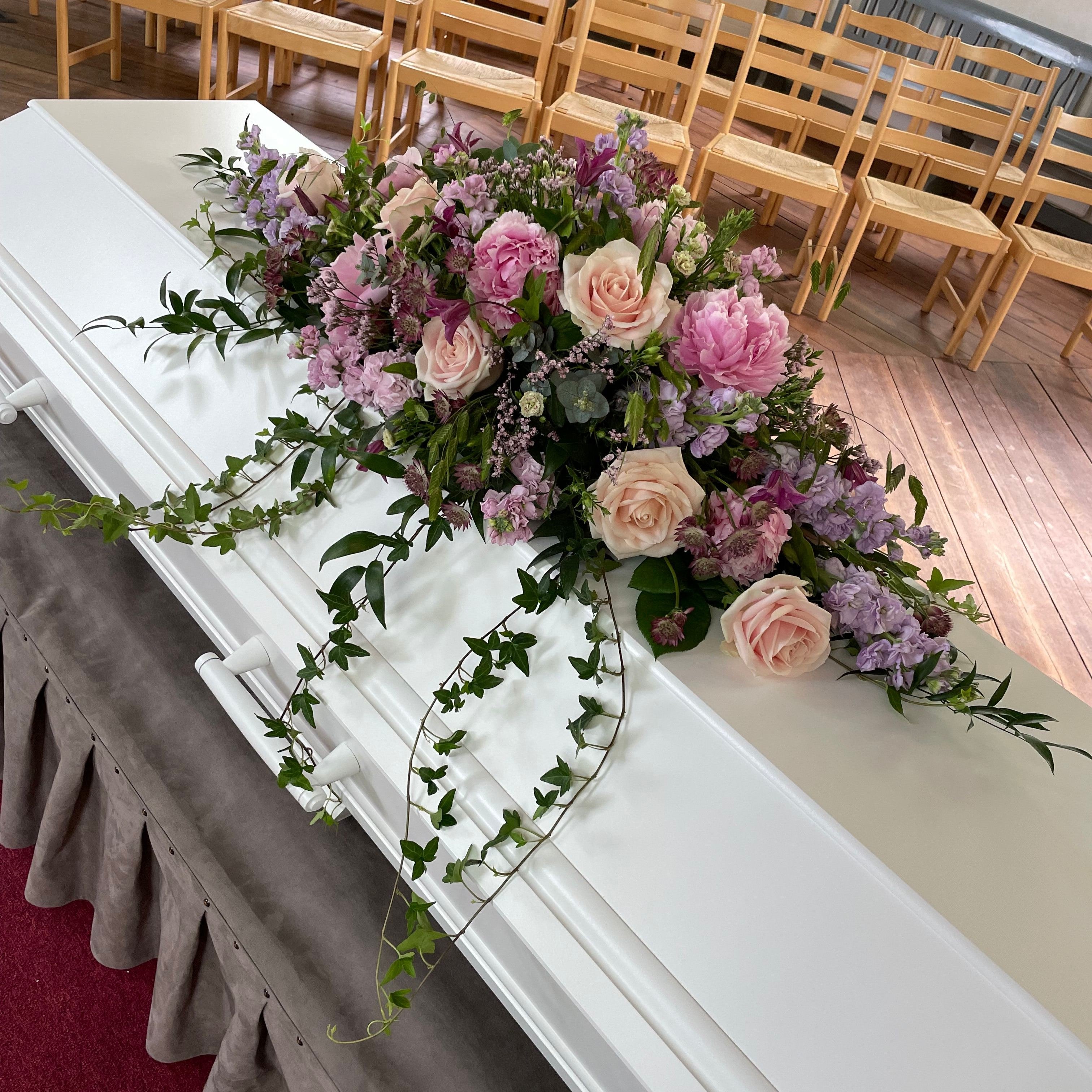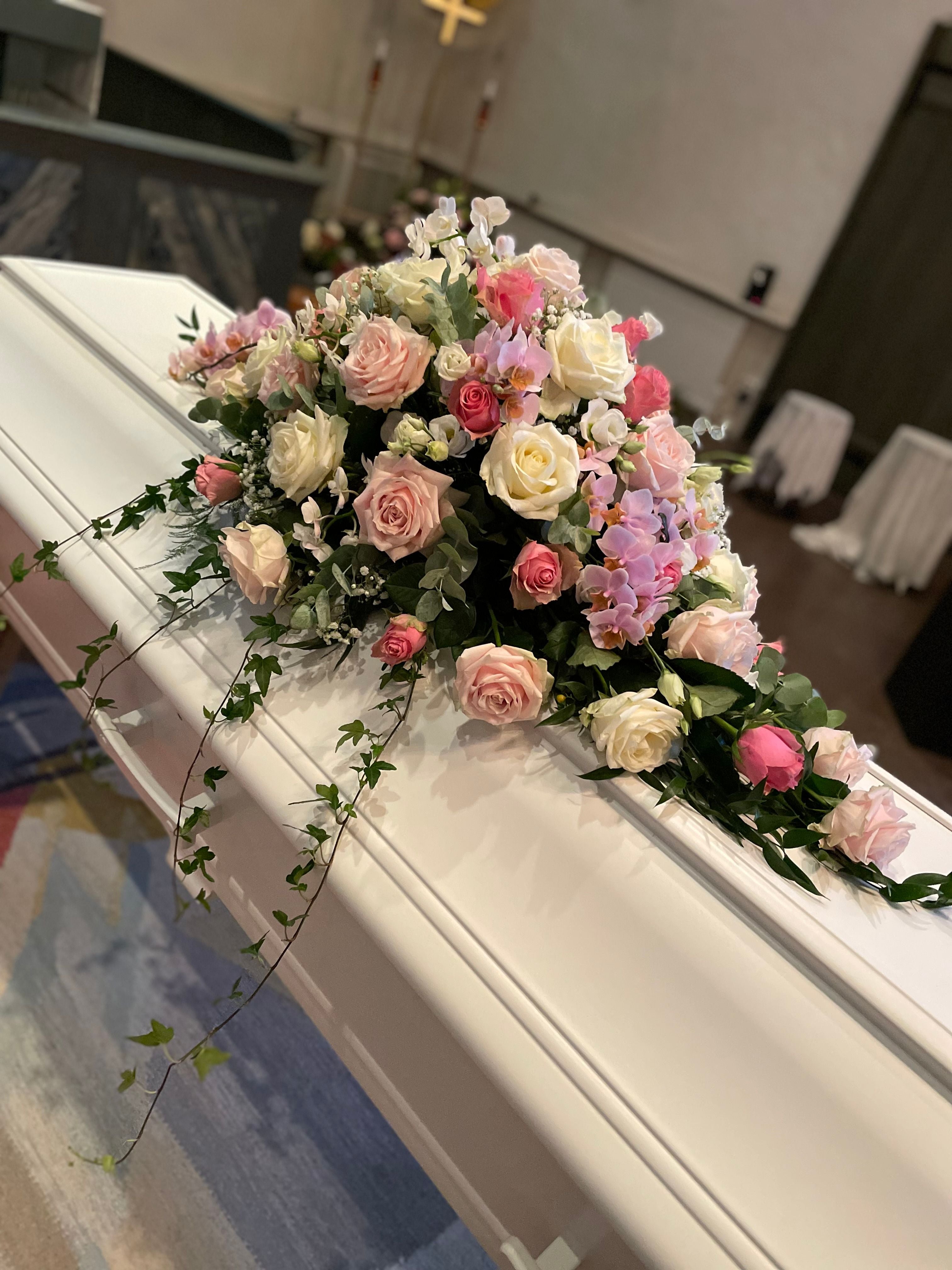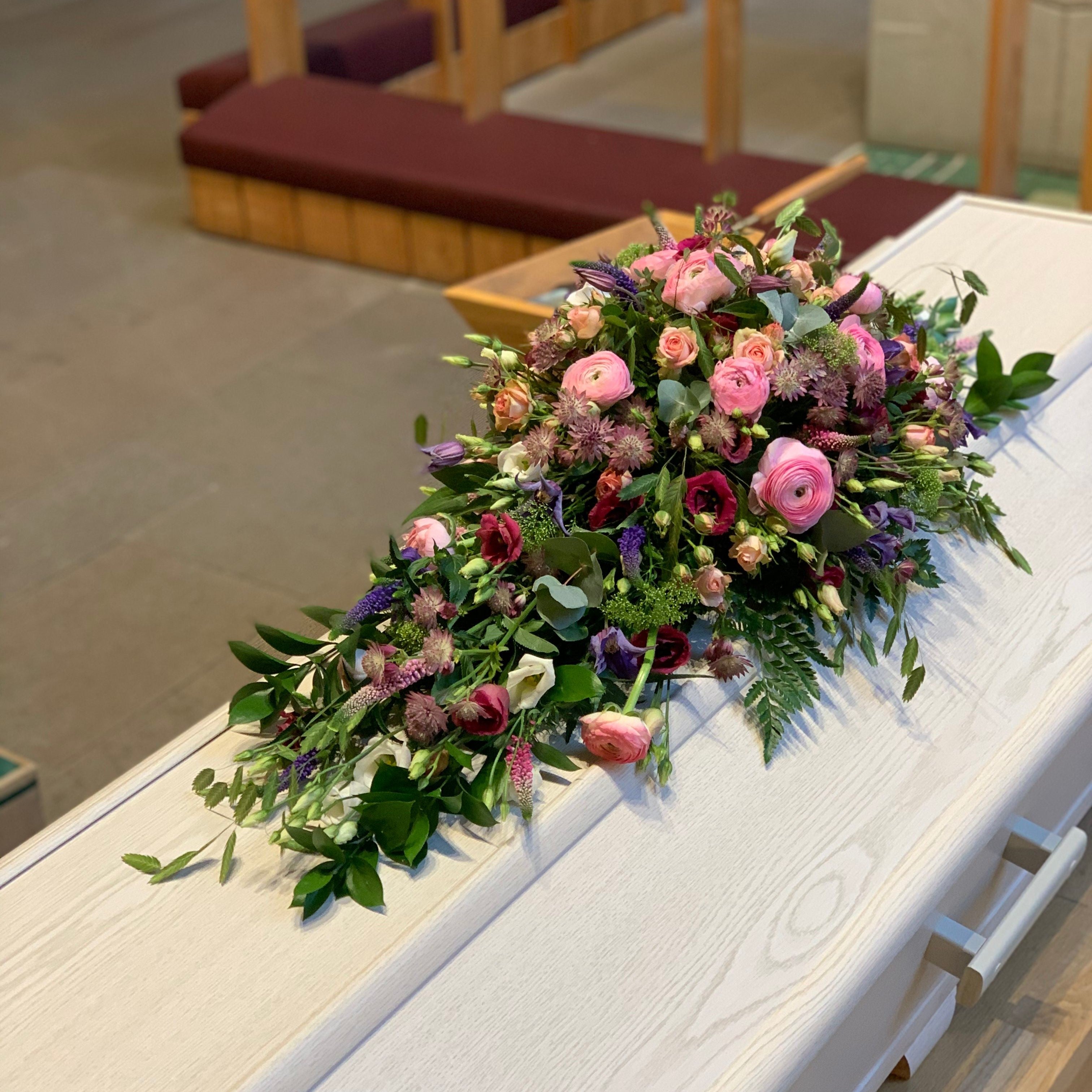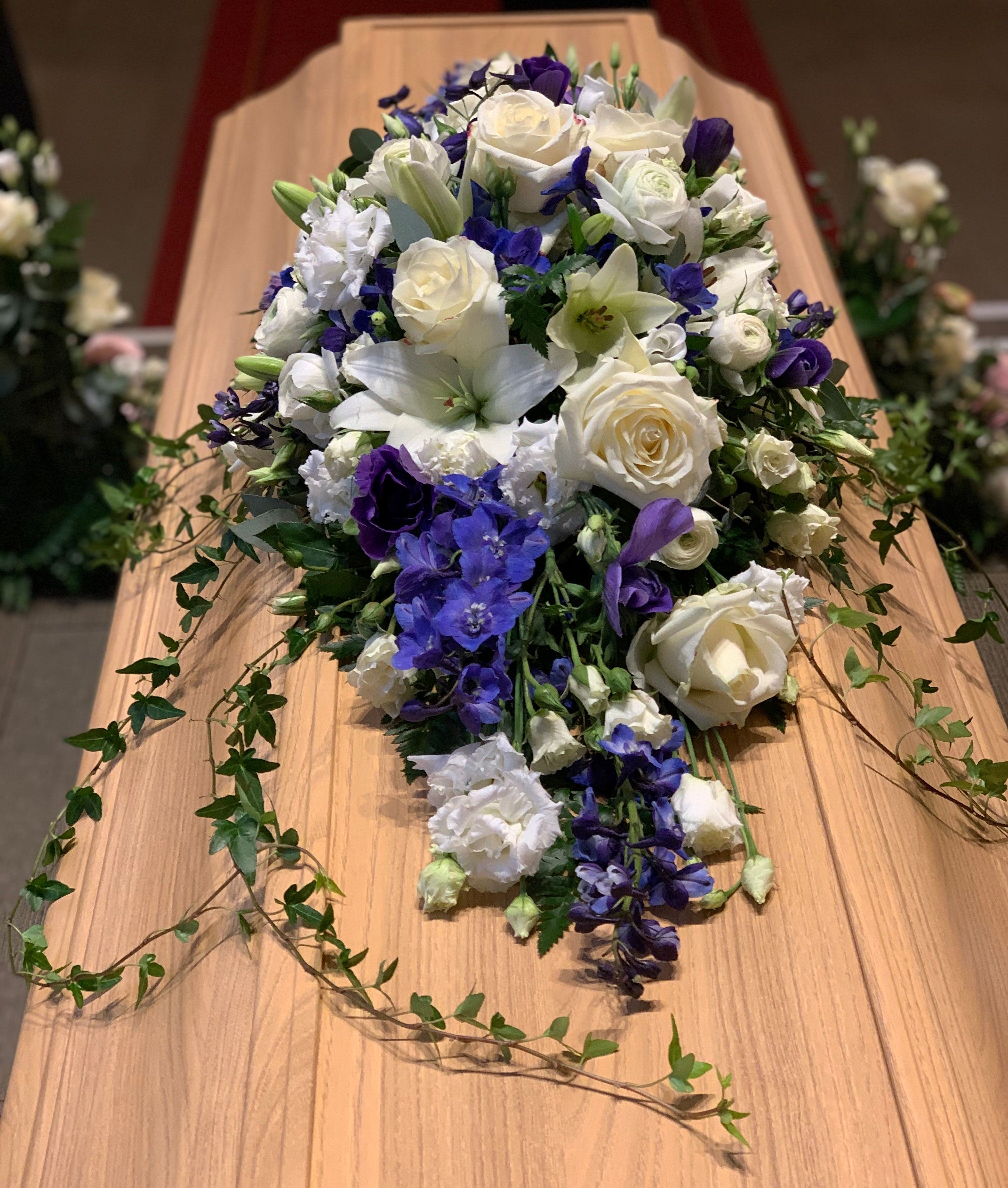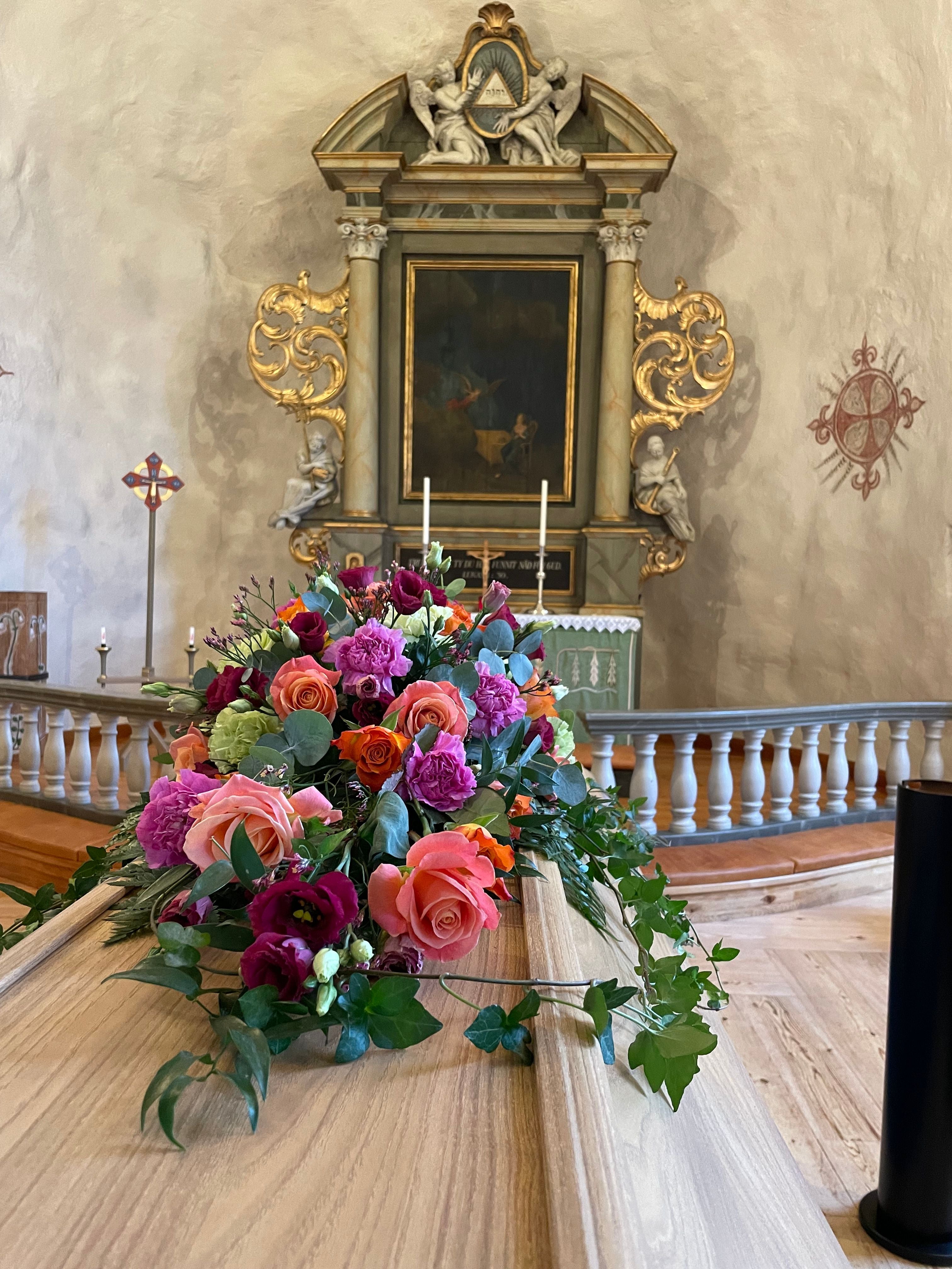 Närmast anhöriga väljer vilka blommor som kistan eller urnan ska dekoreras med. Ibland väljer man även att ha med ett fotografi och något eller några ljus. Ibland vill man ha mer blommor och då kan man placera en dekoration eller en bukett även framför kistan.